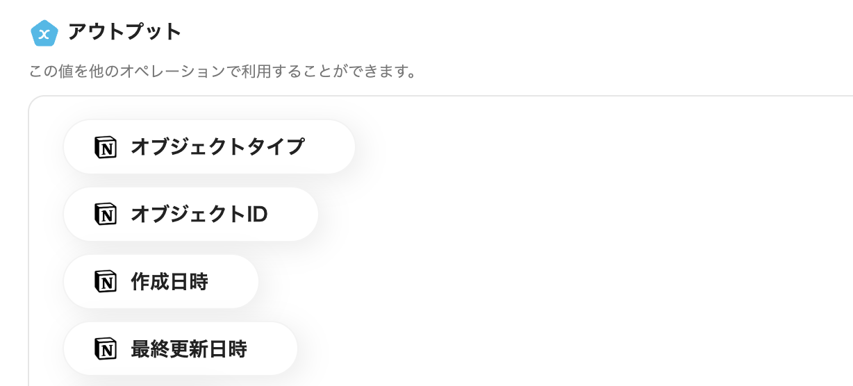アウトプット情報は、「この値を他のオペレーションで利用することができます。」という注釈の通り、この後のステップで引用・活用できます。