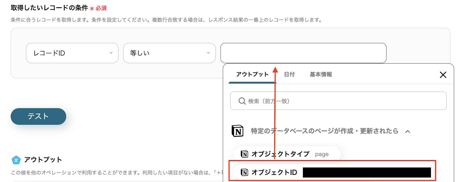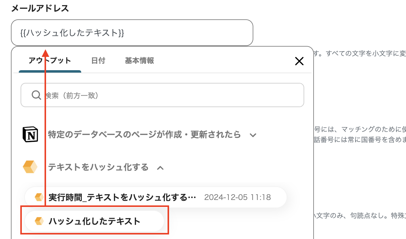 入力バーをクリックすると、前ステップで取得したデータベースIDを基に「候補」として情報が選択できます。