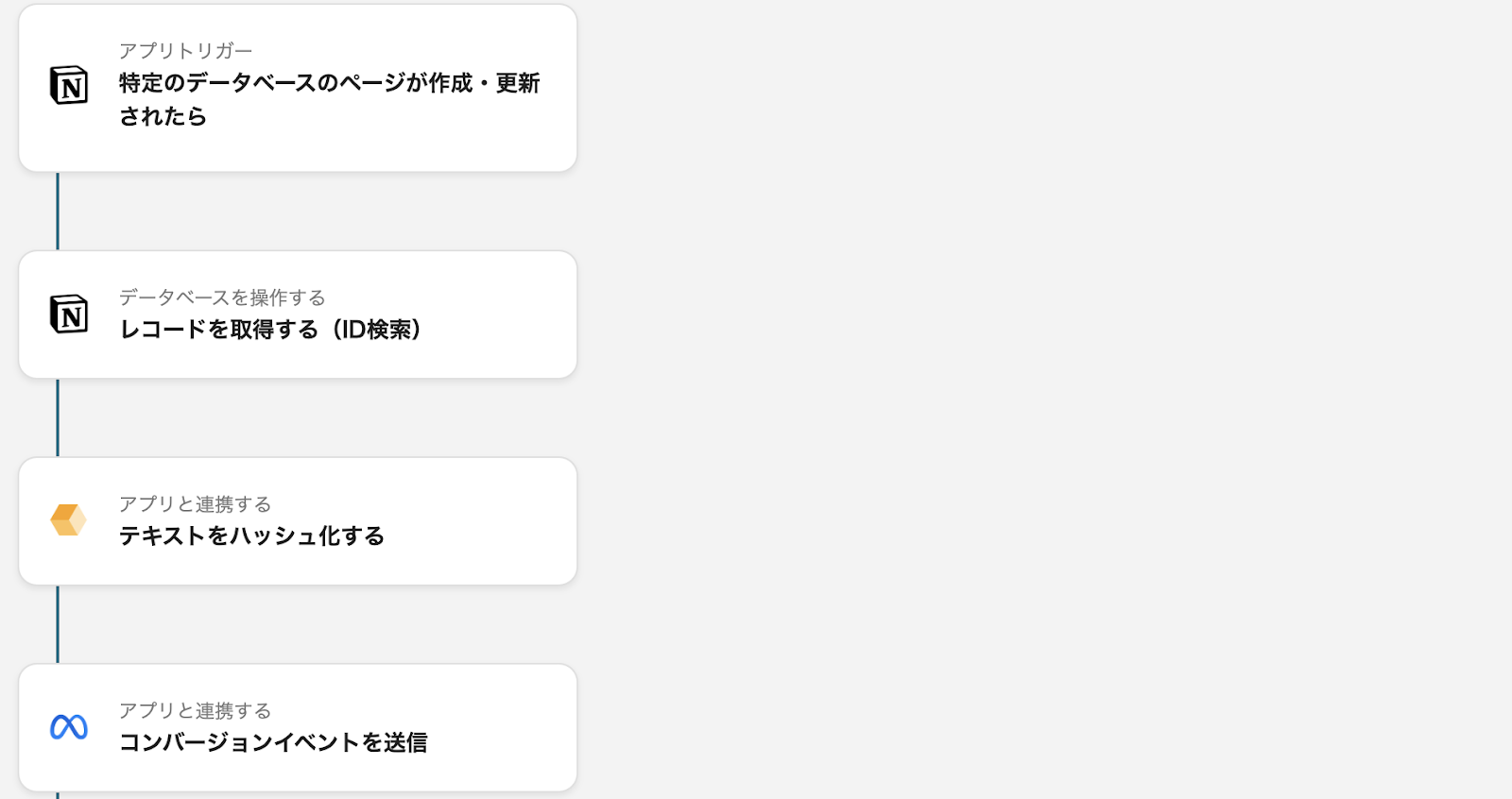 この自動化を導入することで、Google スプレッドシートにレコード登録時、MetaコンバージョンAPI側でコンバージョンイベントを自動で送信できます。