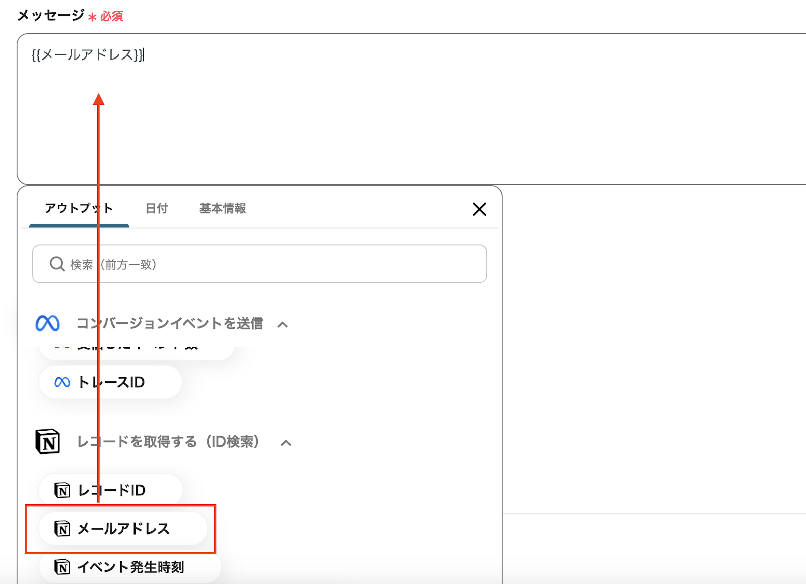 (以下は例として、前ステップで取得した「メールアドレス」の情報を引用したものです。)
