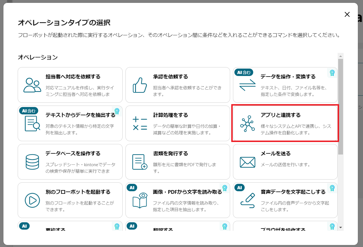- AI機能の「領収書を読み取る」アクションでは、抽出したい項目(合計金額、発行日、店名など)を任意で設定することが可能です。