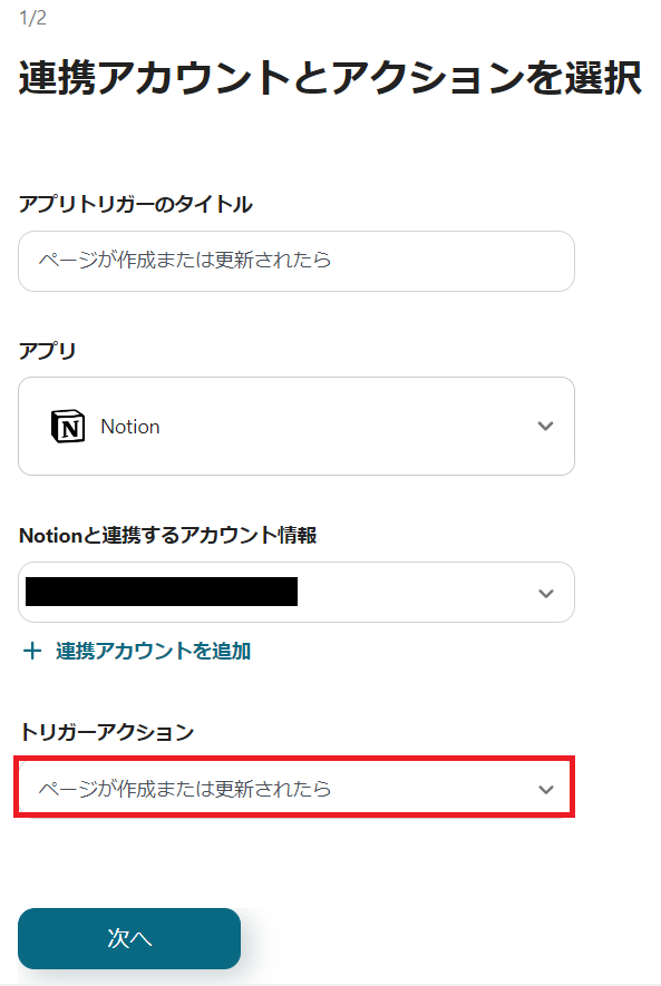 - 次に、トリガーでNotionを選択し、「特定のデータソースのページが作成・更新されたら」というアクションを設定します
