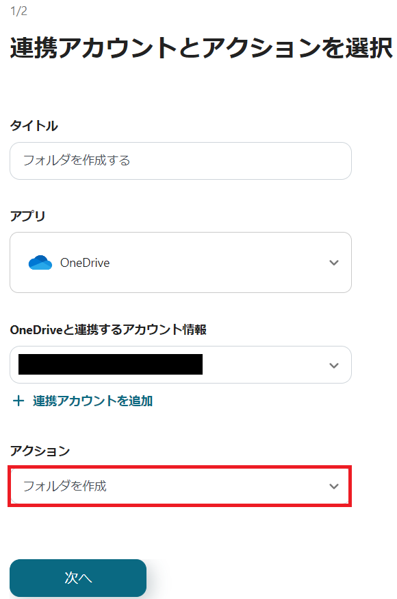 - 最後に、OneDriveの「フォルダを作成」アクションを設定し、Notionから取得した情報をもとにフォルダを作成します