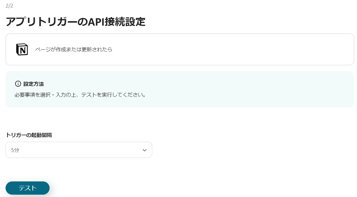 - トリガーは5分、10分、15分、30分、60分の間隔で起動間隔を選択できます。