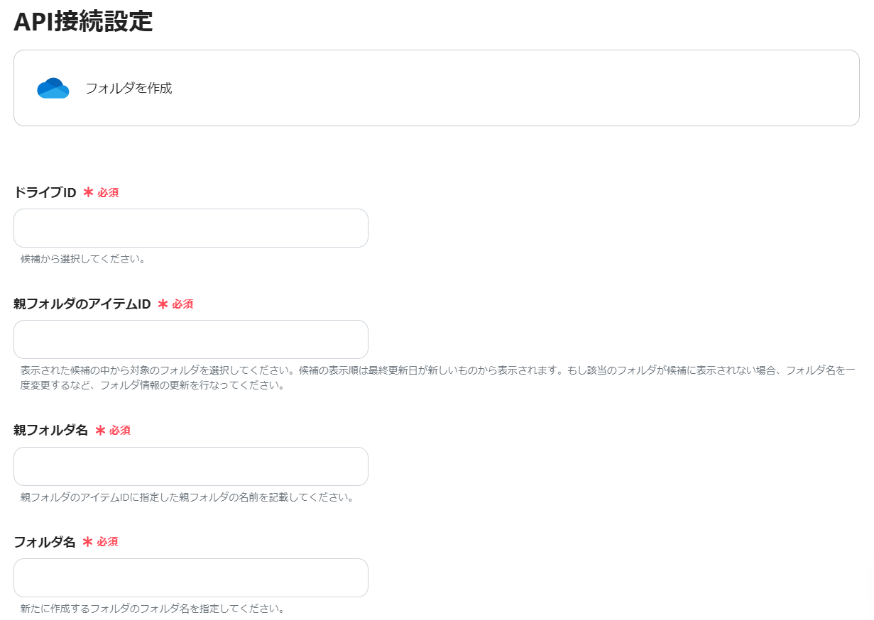 - OneDriveでフォルダを作成するアクションでは、フォルダを作成する先のドライブIDや親フォルダのアイテムID(特定のフォルダ配下に作成する場合)、親フォルダ名を任意で設定してください。