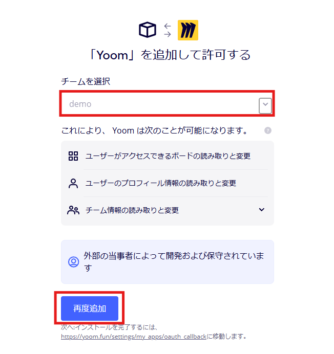 3.Yoomと連携するチームを選択し、「追加」をクリックします。