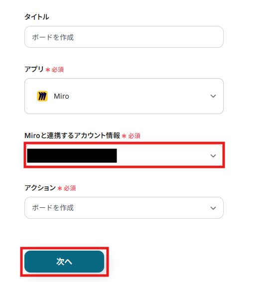 (2)「Miroと連携したいアカウント情報」で運用したいMiroのアカウント情報を選択し、「次へ」をクリックします。