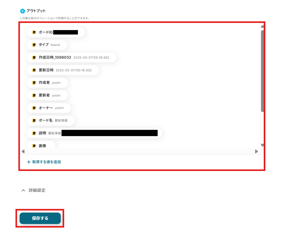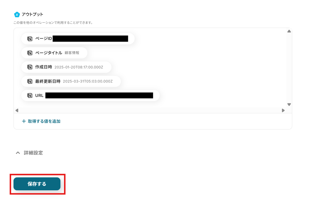 「アウトプット」にページの情報が正常に抽出されていれば、「保存する」をクリックして設定完了です。