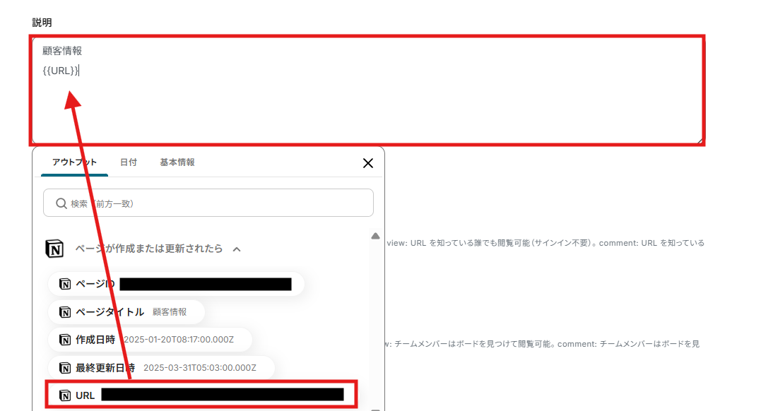 「顧客情報」のように直接文章を入力することも可能ですが、「アウトプット」から説明に追加したい項目を引用することもできます。