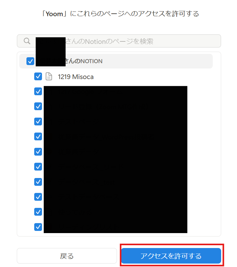 Notionと検索してください。 ログインが完了したら、アクセスしたいページをチェックします。 (後のデータベース連携で、追加したいページを表示させるためです。)