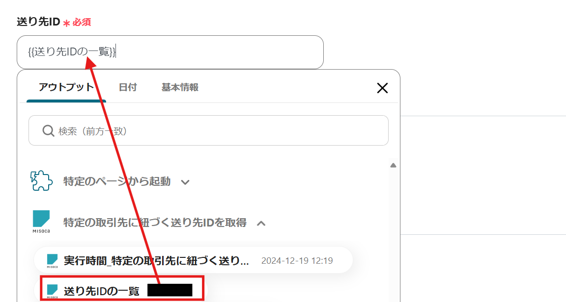 ※Misoca上で一つの取引先に対して複数の送り先IDが設定されている 場合、リスト形式で送り先IDの値が取得されます。 そのため、複数の送り先IDが指定されている場合は、「リスト型のアウトプットを個々のアウトプットに分割 」というアクションを挟むことで、アウトプットとして利用できるようになります。 詳しくはこちらの記事 で確認できます。
