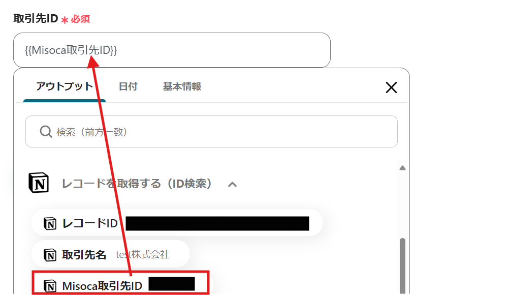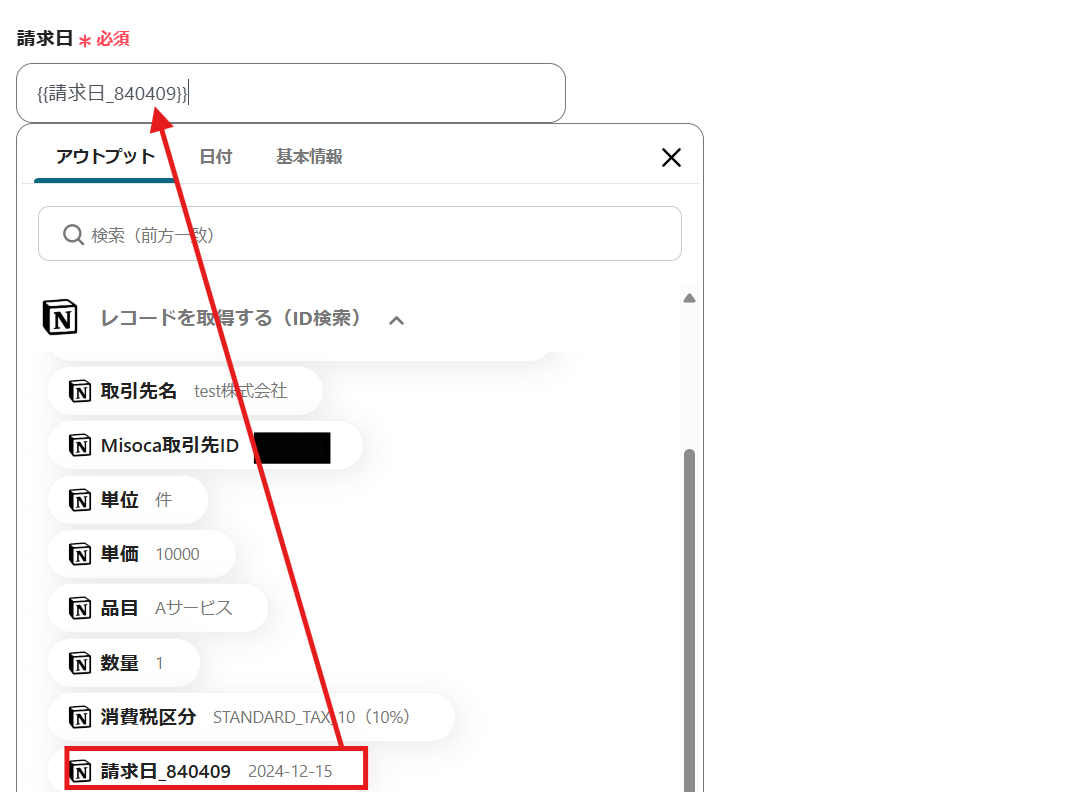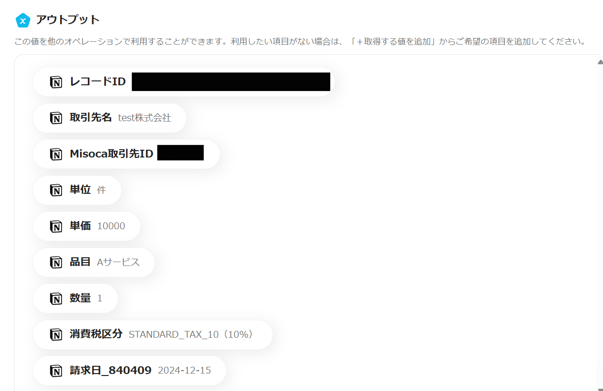 こちらもテストし、成功したら保存します。 Misoca側を確認してみましょう。 赤枠がアウトプット利用箇所になります。