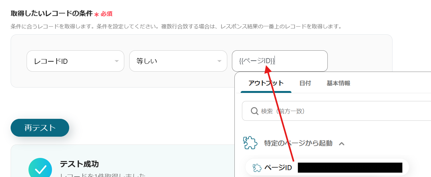 続いて「レコードを取得する(ID検索) 」をクリックしましょう。 データベースの連携をしましょう。