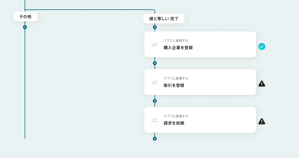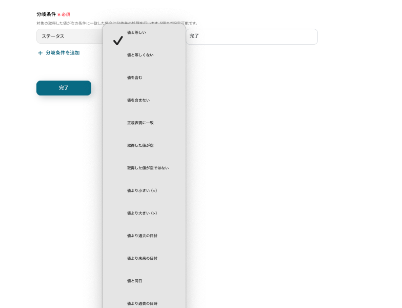 画像の場合は「レコードを取得する」のフローで取得した値「ステータス」の項目が「完了」になっているものは次のフローに進むように設定されます。