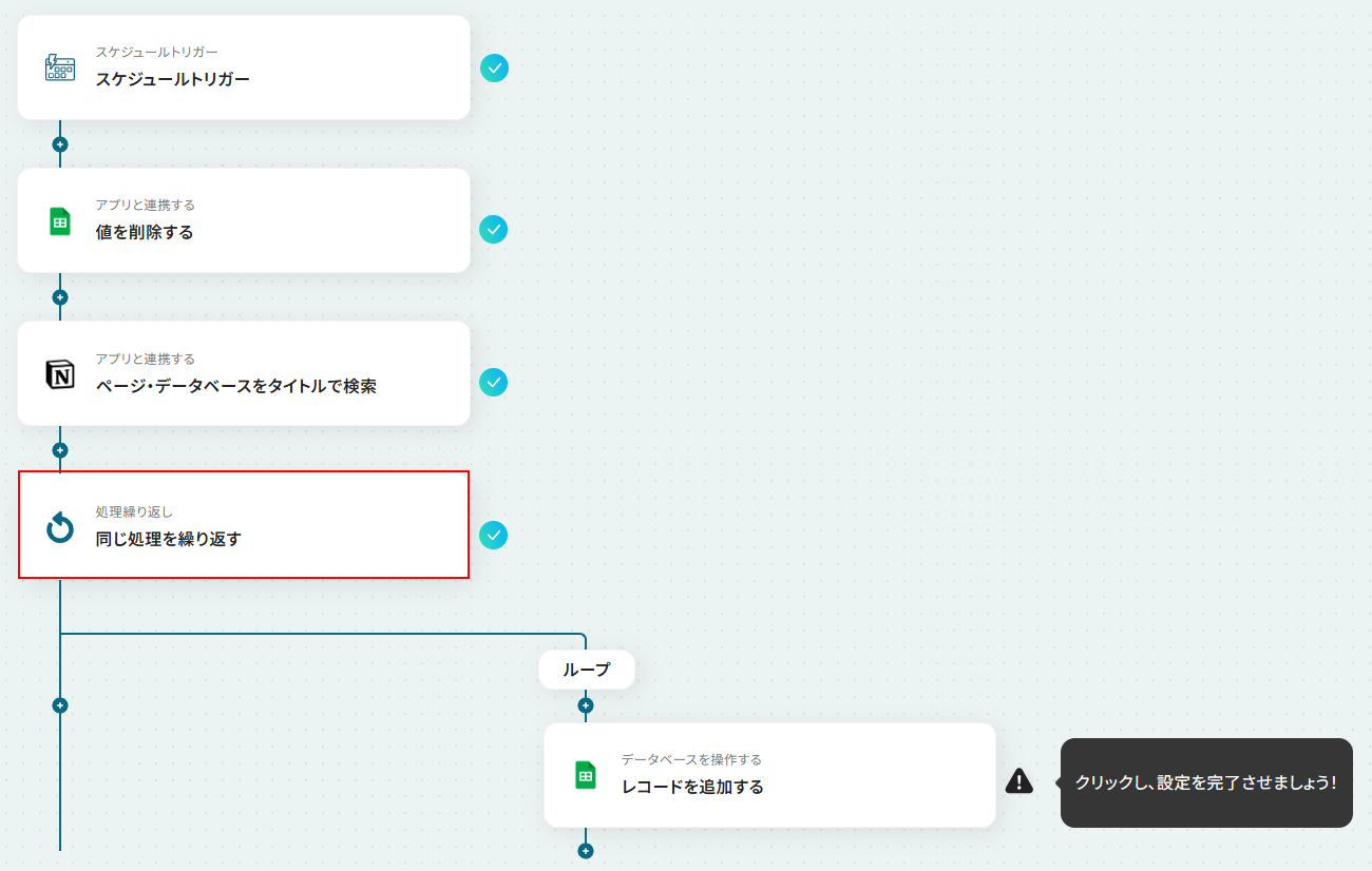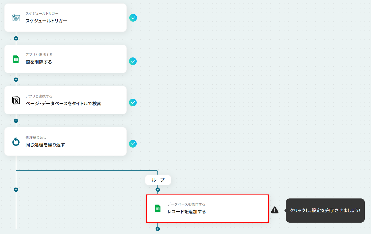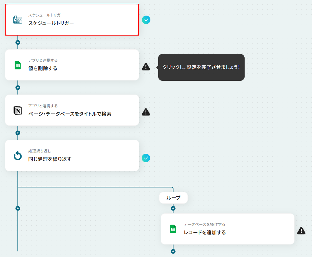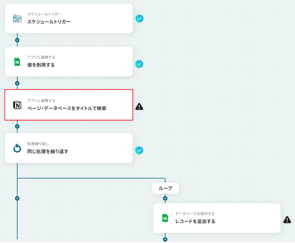 お疲れ様でした!ここまでで設定は完了です! 以上が定期的にNotionのデータベースからページ一覧を取得し、Google スプレッドシートに自動で記録する フローでした!