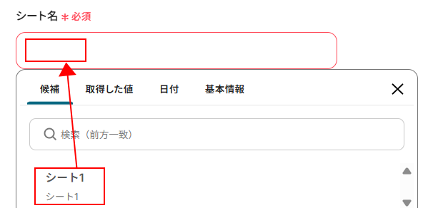 シート名を設定します。 入力欄をクリックし、使用予定のシートを選択してください。