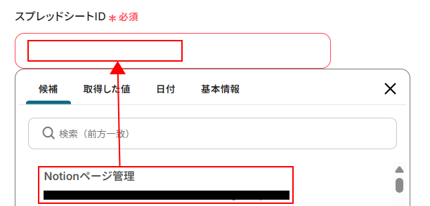 スプレッドシートIDを設定します。 入力欄をクリックし、表示された候補の中からページ一覧取得に利用したいスプレッドシートを選択します。