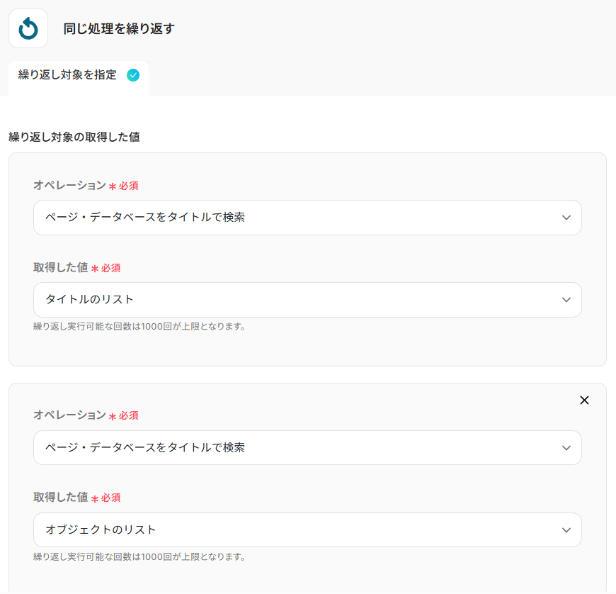 同じ処理を繰り返すでは、先ほど複数取得したデータをそれぞれ個別に利用できるように処理を行います。 今回はデフォルトでタイトルのリスト、オブジェクトのリスト、オブジェクトIDのリスト、結果のURLのリスト、作成日時のリスト、最終更新日時のリストが設定されています。