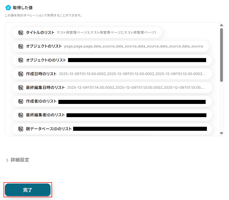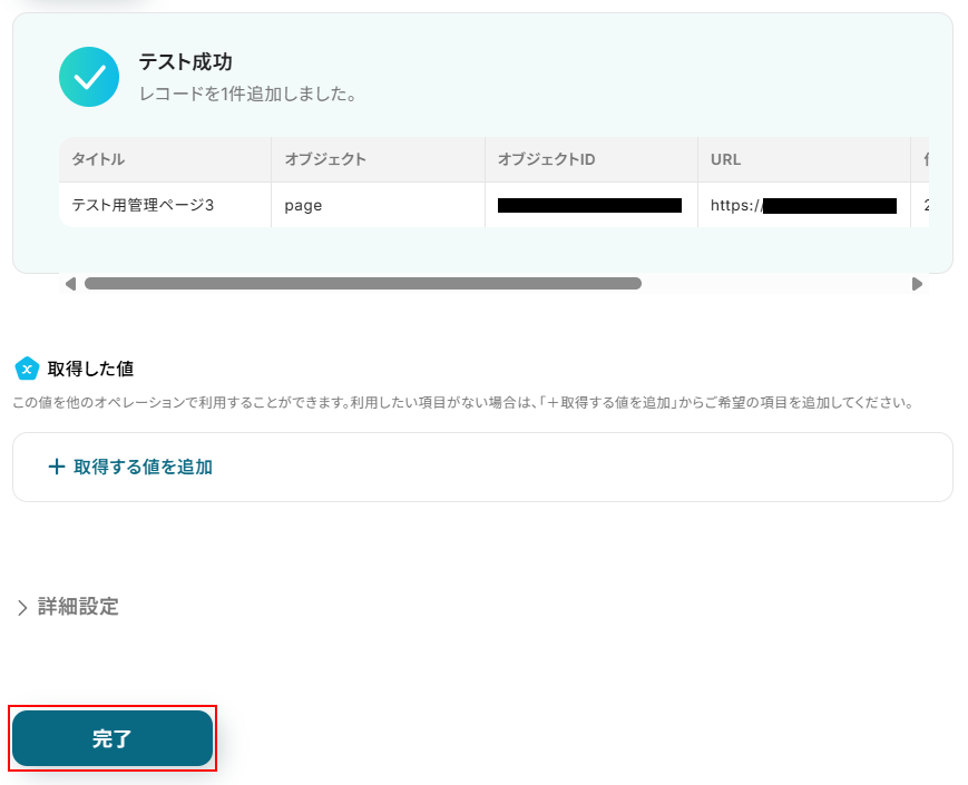 テストに成功するとテスト成功画面と取得した値が表示されますのでご確認ください。 確認できたら完了 をクリックしましょう。