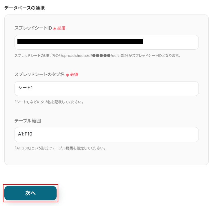 スプレッドシートID、スプレッドシートのタブ名はステップ4で設定したものと同じものを設定します。
