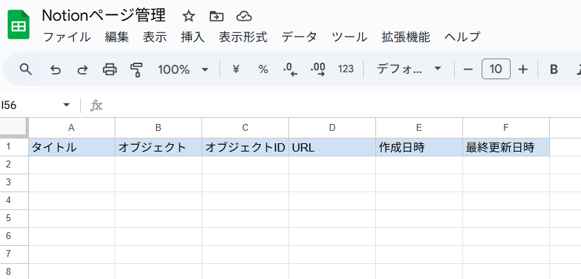 Google スプレッドシートを用意する 今回ご紹介するテンプレートでは同じGoogle スプレッドシートを利用し、古いページ一覧を削除したあと、新しいページ一覧を表示します。 そのため、すでに入力されているGoogle スプレッドシートの値の削除を行ったあとに、Google スプレッドシートにNotionのページ一覧を保存するといったように進みます。 今回は削除のテストも行うため、以下のGoogle スプレッドシートを用意しました。