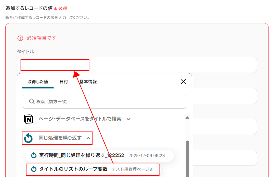 追加するレコードの値を設定します。 この項目には先ほど連携したスプレッドシートに設定している項目名が表示されます。 それぞれ取得した値を設定しましょう。 取得した値を活用することで、固定値ではなく、トリガーが実行されるたびに最新の情報が反映できます。 また、取得した値は以下のように入力欄をクリックすることで設定できます。 ※取得した値は同じ処理を繰り返すの項目にある〇〇のループ変数 となっているものを選択してください。