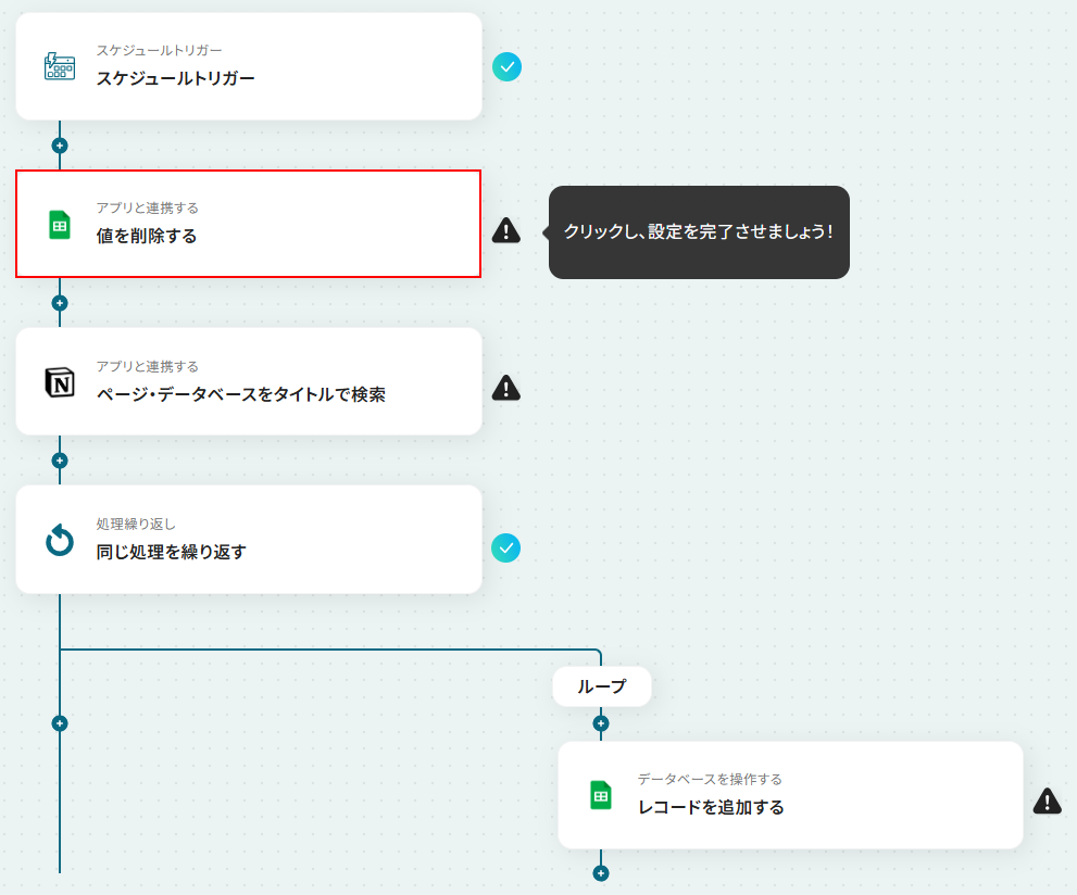 Notion、Google スプレッドシートのそれぞれとYoomを連携してください 「同じ処理を繰り返す」オペレーション間の操作は、チームプラン・サクセスプランでのみご利用いただける機能となっております。フリープラン・ミニプランの場合は設定しているフローボットのオペレーションやデータコネクトはエラーとなりますので、ご注意ください チームプランやサクセスプランなどの有料プランは、2週間の無料トライアルを行うことが可能です。無料トライアル中には制限対象のアプリや機能(オペレーション)を使用することができます