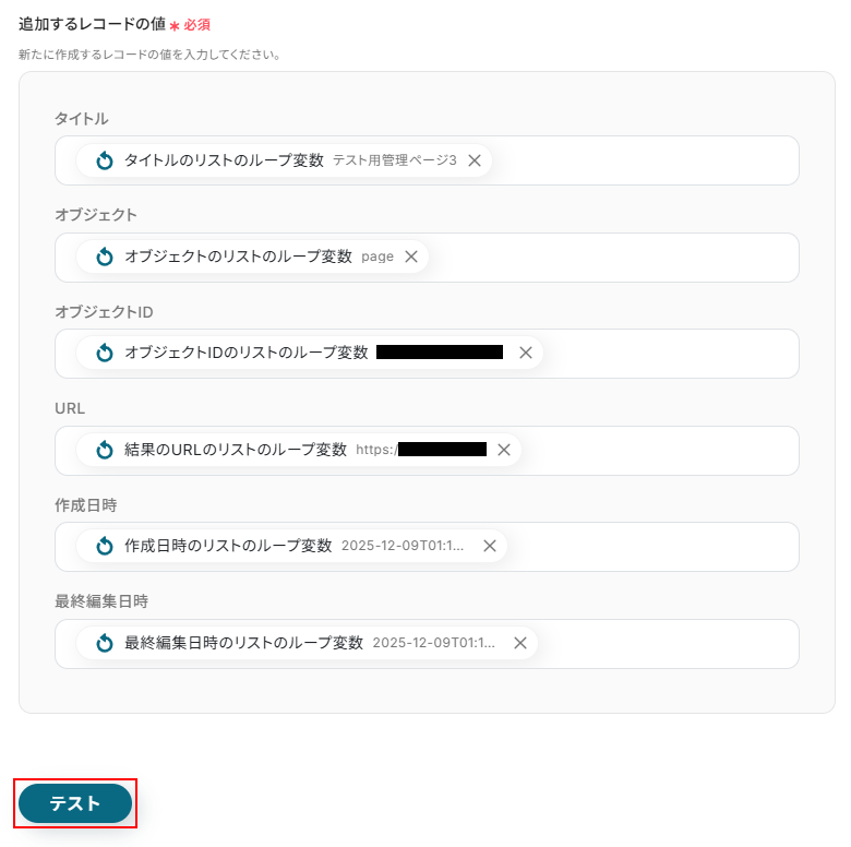 全て設定できたらテスト をクリックしましょう。 ※テストをクリックすると実際にレコードが追加されます。