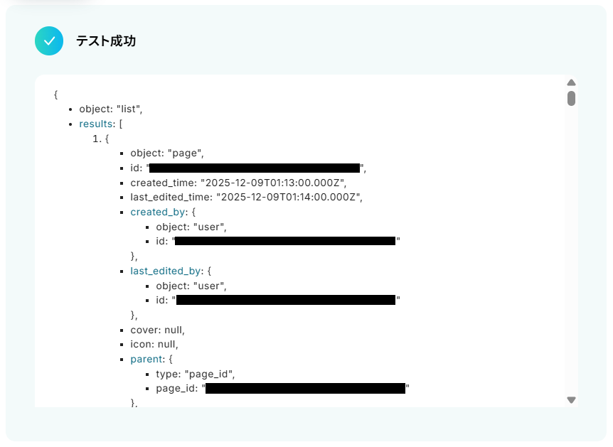 テストに成功するとテスト成功画面が表示され、取得した値が表示されます。 取得した値は実行した結果が設定される動的な値として利用できるため、このあとの設定でも使用します。