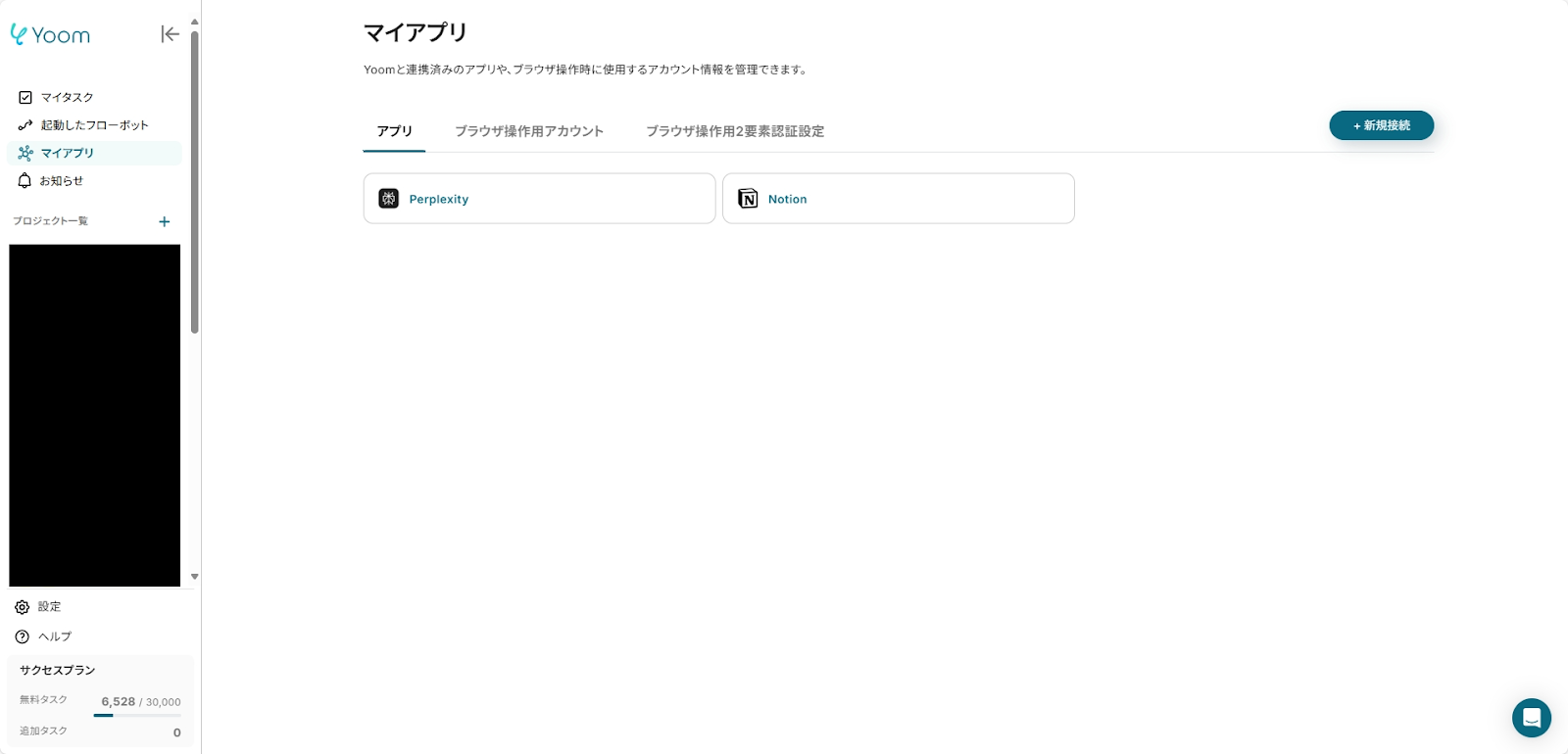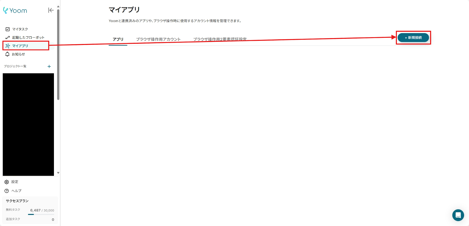 1.Yoom管理画面のサイドバーから「マイアプリ」を選択します。 2.右側の「+新規接続」をクリックします。