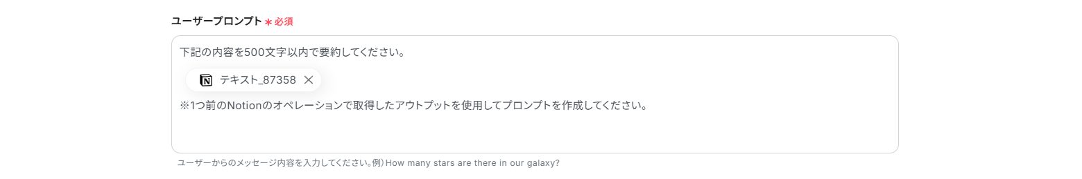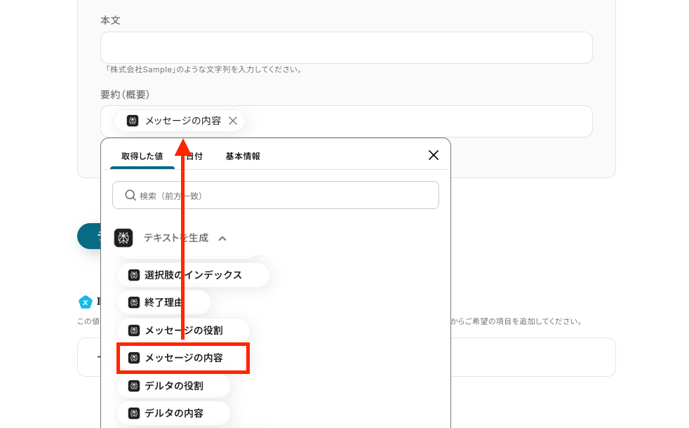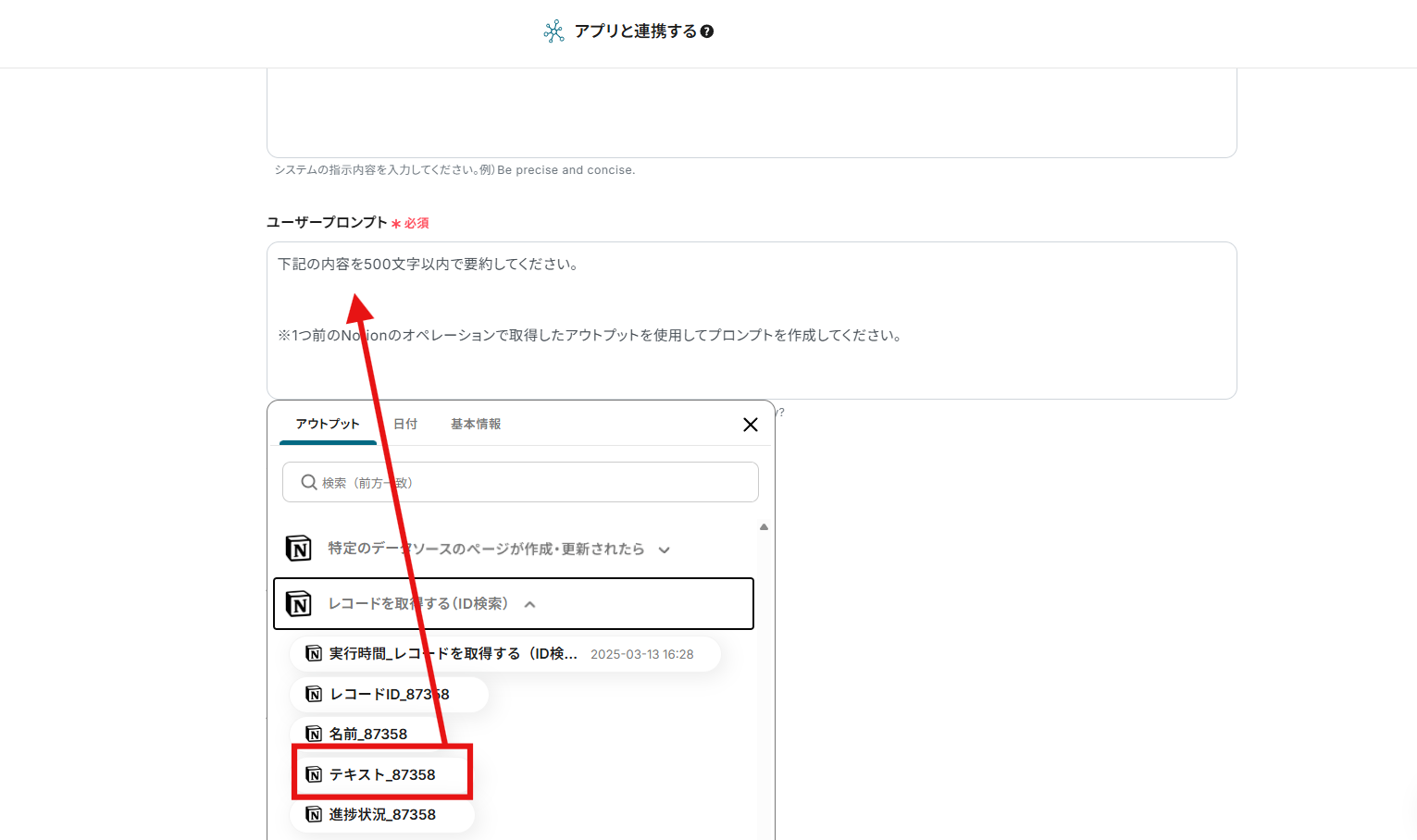 4.「ユーザープロンプト」には、要約する内容を入力します。 今回はデータベースから取得したレコードを要約するため、プルダウンの『取得した値』から要約したい項目をクリックで選択します。