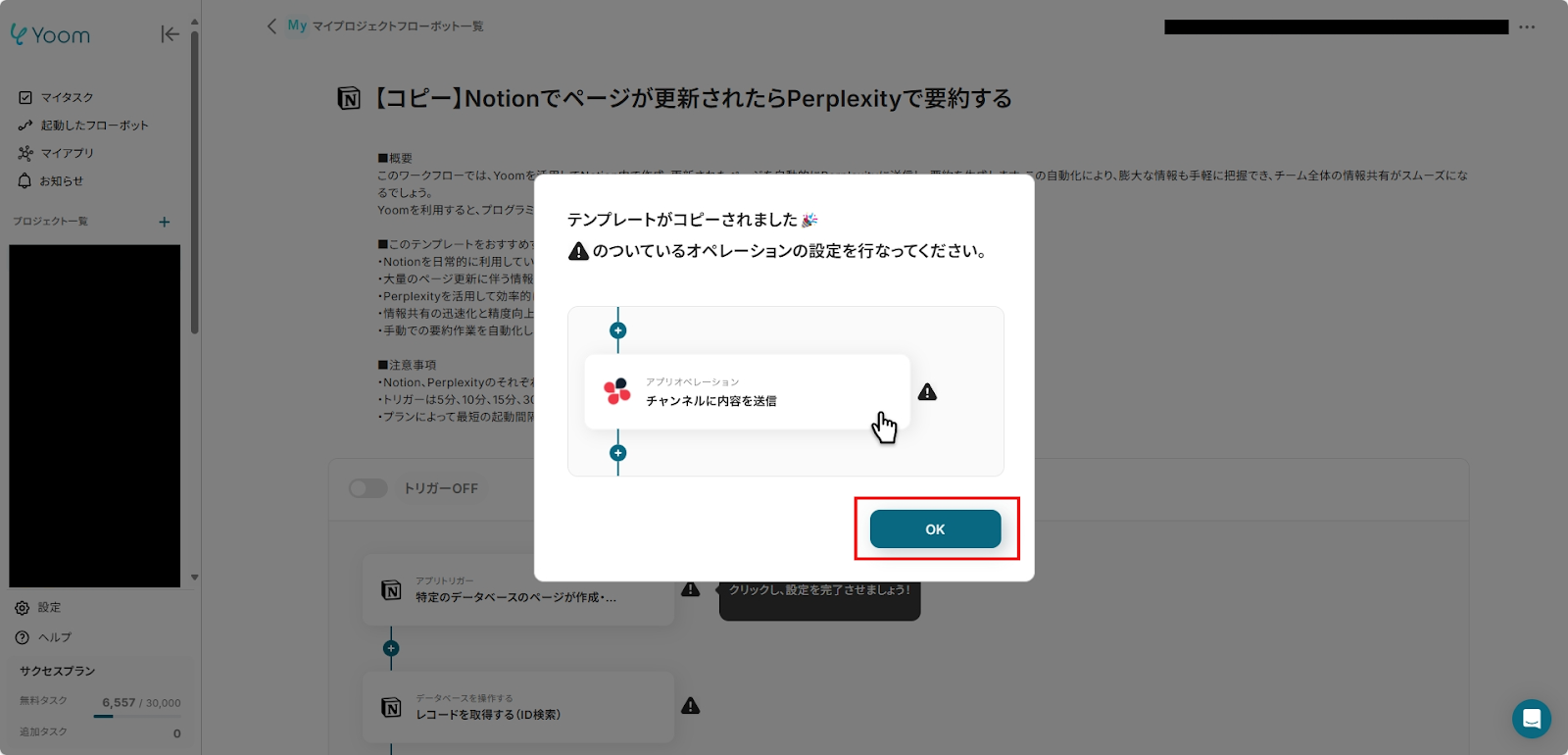 2.お使いのYoom管理画面にテンプレートがコピーされます。 「OK」をクリックして、フローの設定に進みましょう。