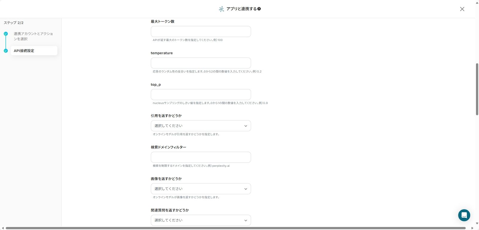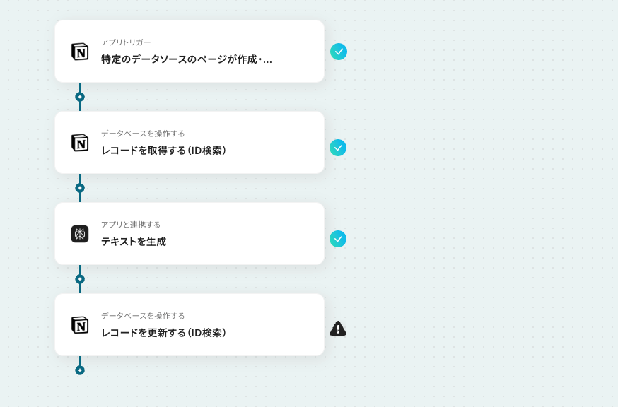Perplexityで情報を要約するアクションでは、プロンプトを編集することで、「箇条書きで要約して」や「300字以内でまとめて」など、生成する要約の形式や内容を自由に設定できます。 Notionのレコードを更新するアクションでは、要約を書き込むプロパティを任意で指定したり、前段で取得したデータと固定のテキストを組み合わせて出力内容を調整したりすることが可能です。 ■注意事項