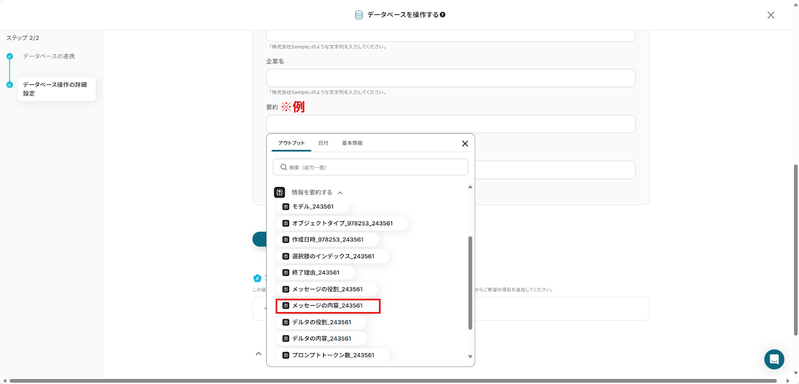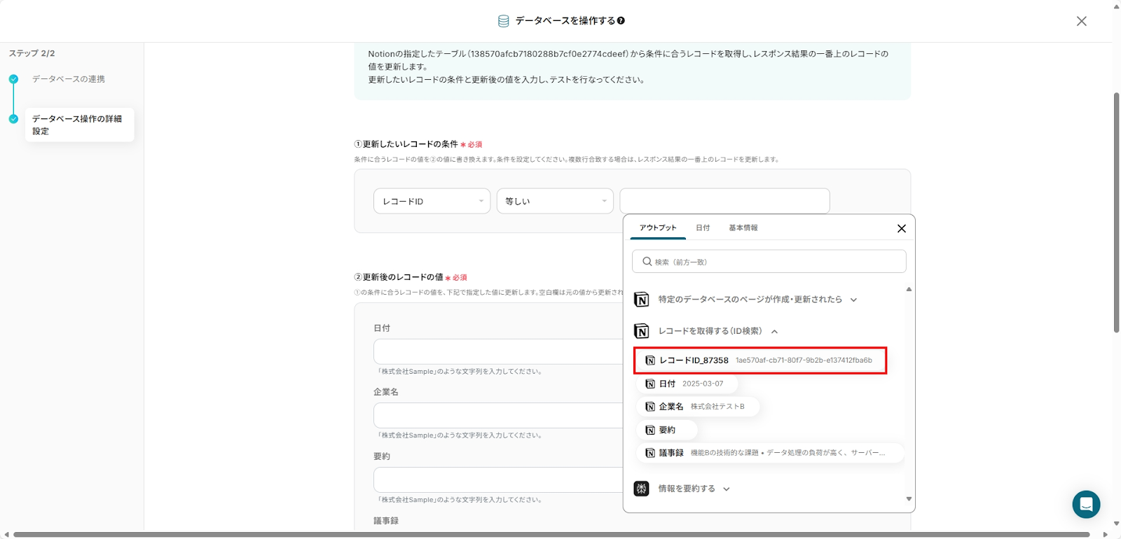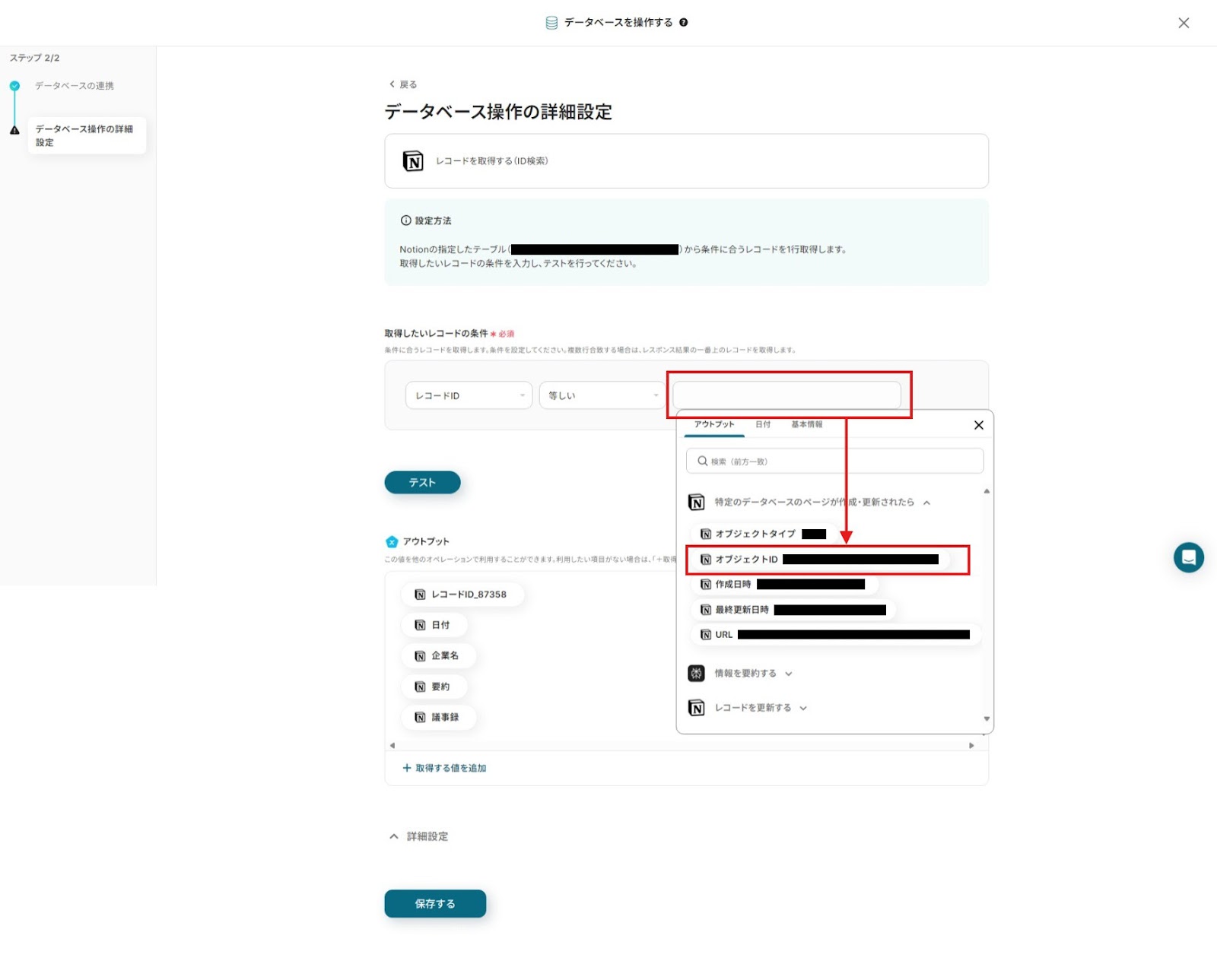 作成・更新されたレコードが取得されるよう、プルダウンのアウトプットから「オブジェクトID」を選択します。
