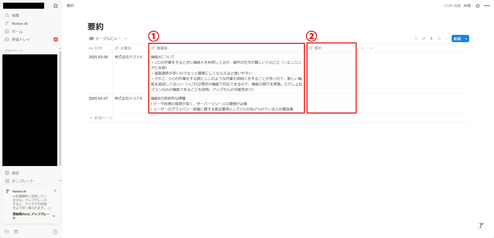 前提 本フローボットでは、Notionのデータベースから「①要約したいカラム」を取得して、「②要約したカラム」に要約した内容を更新します。 ※添付画像の①②参照 それぞれのカラムが存在するデータベースをご用意ください。