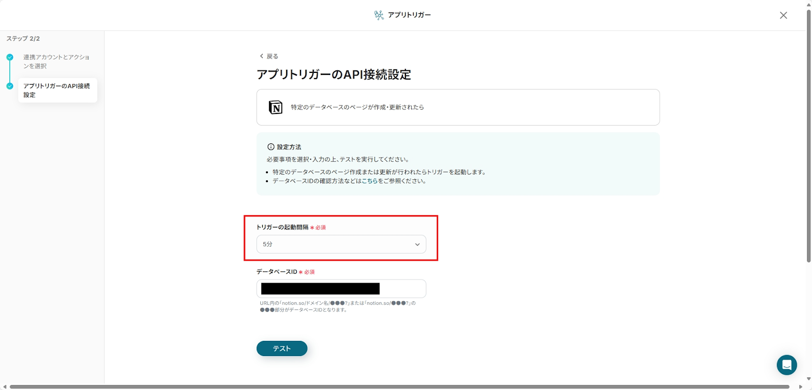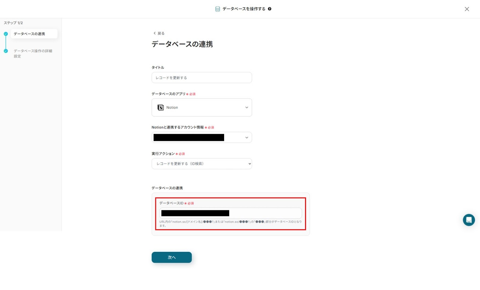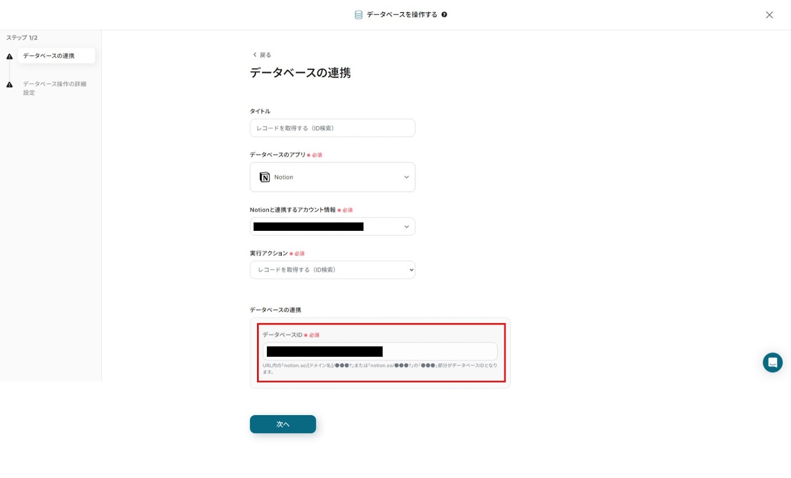 2.「データベースID」に対象となるデータベースのID(Step3の手順4で入力したものと同一)を入力し、「次へ」をクリックします。