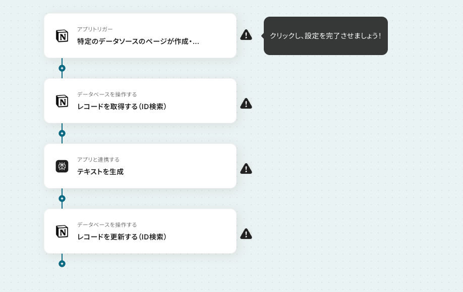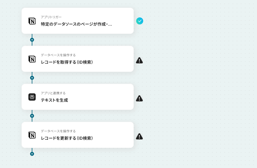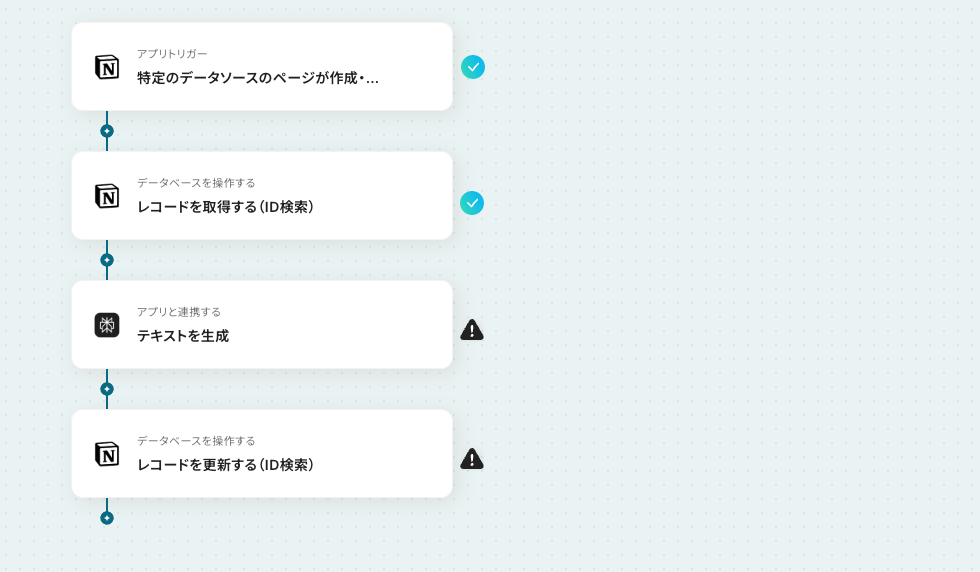 ステップ3:Notionの起動設定 フローの起点となるトリガーアクションを設定します。 このフローは、Notionのデータソースのレコードが作成・更新された際に起動します。 1.「特定のデータソースのページが作成・更新されたら」をクリックします。