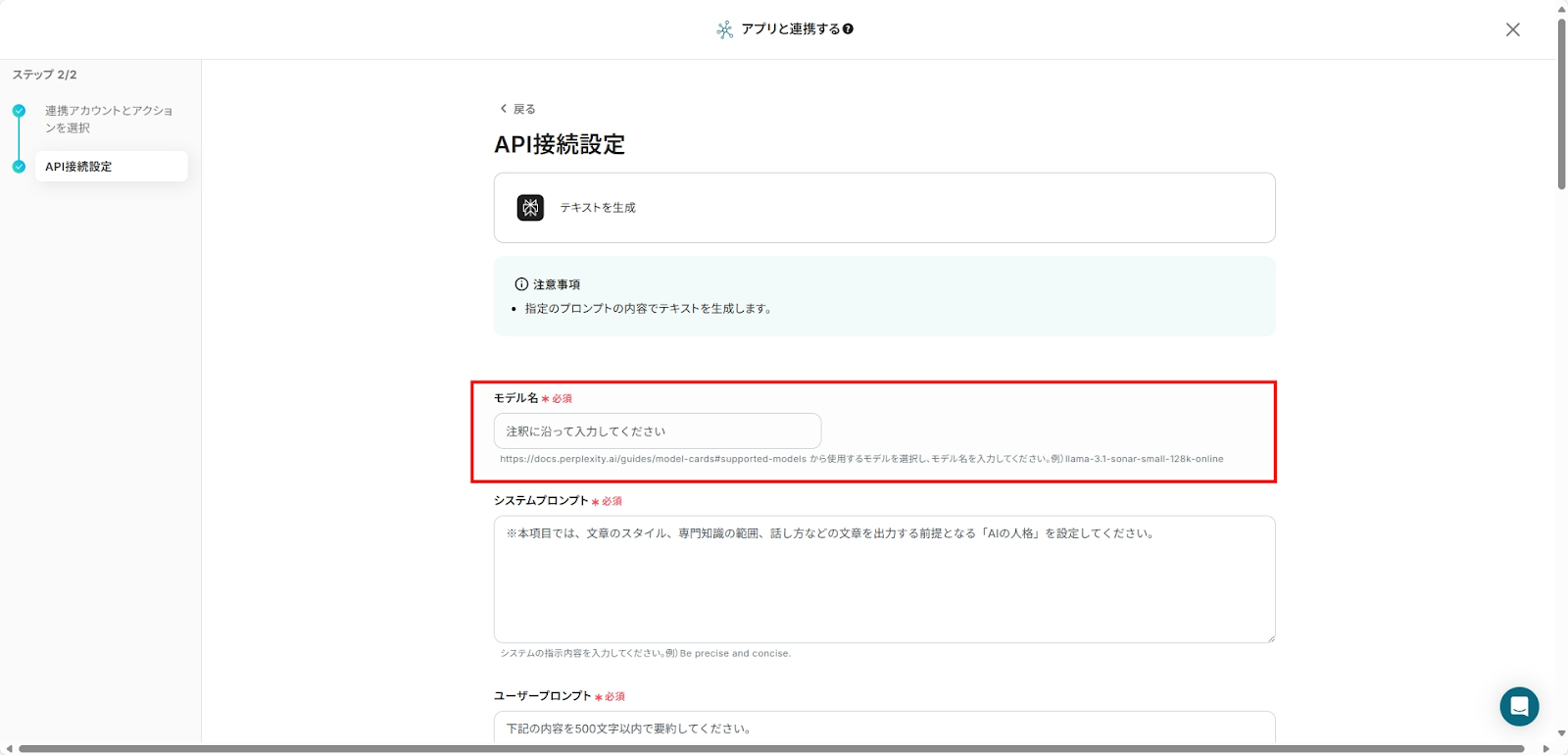 ステップ5:Perplexityのアクション設定 Notionから取得したレコードをPerplexityで要約します。