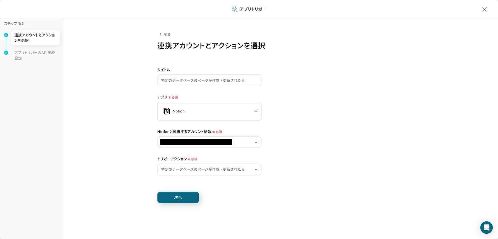 2.表示された項目を確認し、トリガーアクションは変更せずに「次へ」をクリックします。