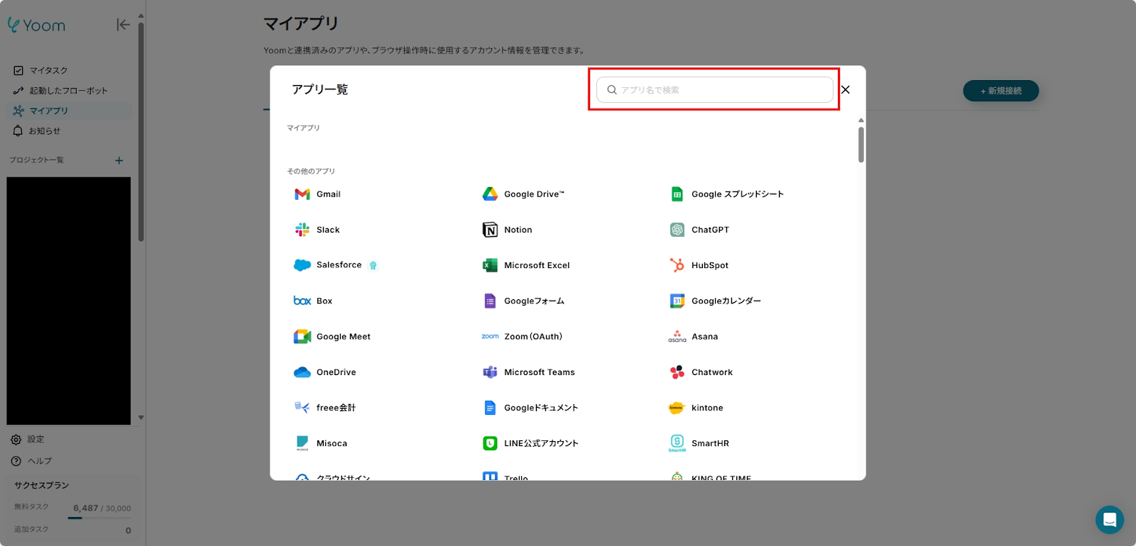 8.次にPerplexityを連携しましょう。 「マイアプリ」で「+新規接続」をクリックした後、「アプリ一覧」が表示されたら、Perplexityを検索して選択します。