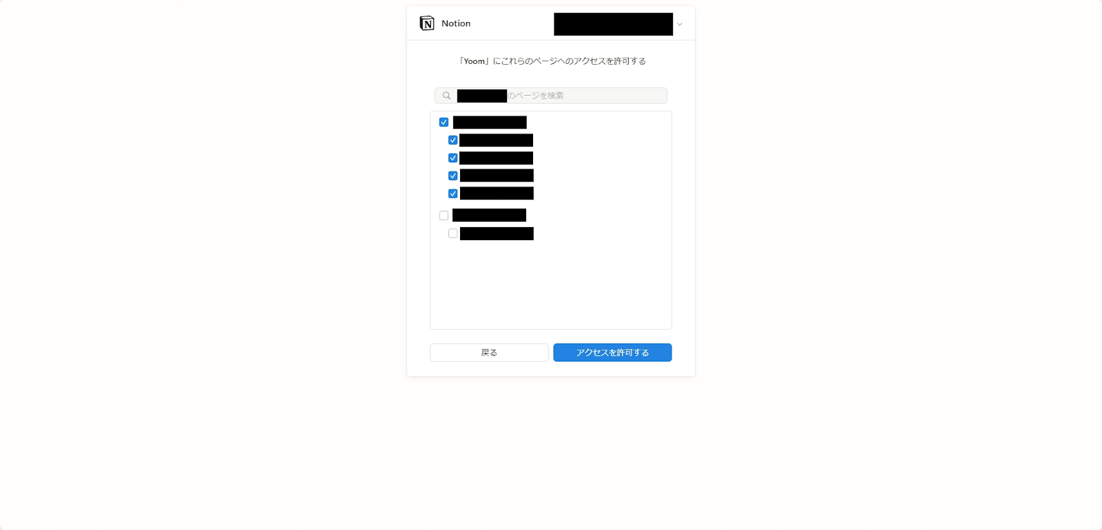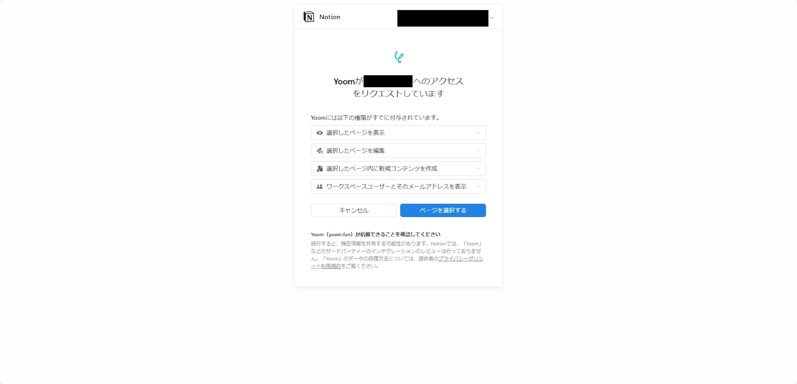 5.YoomがNotionへのアクセスをリクエストするため、「ページを選択する」をクリックします。