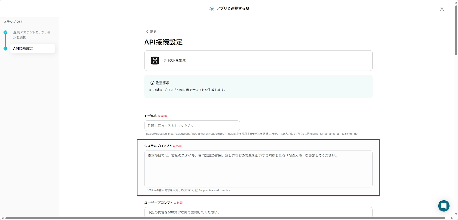 3.「システムプロンプト」には、どのような要約を行うかの指示内容を任意で入力します。