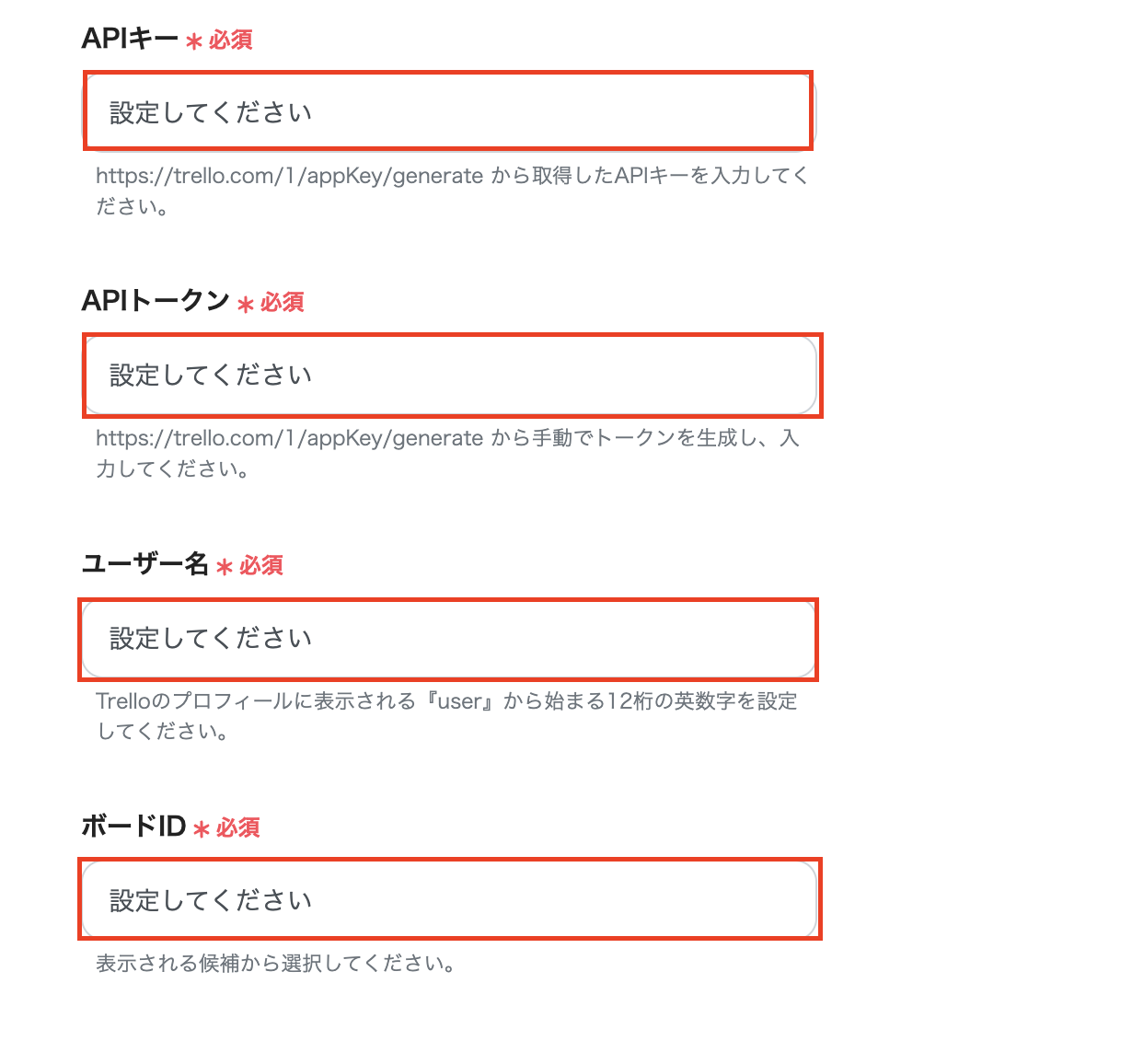 APIキー、APIトークン、ユーザー名、ボードIDを設定し、「次へ」をクリックします。