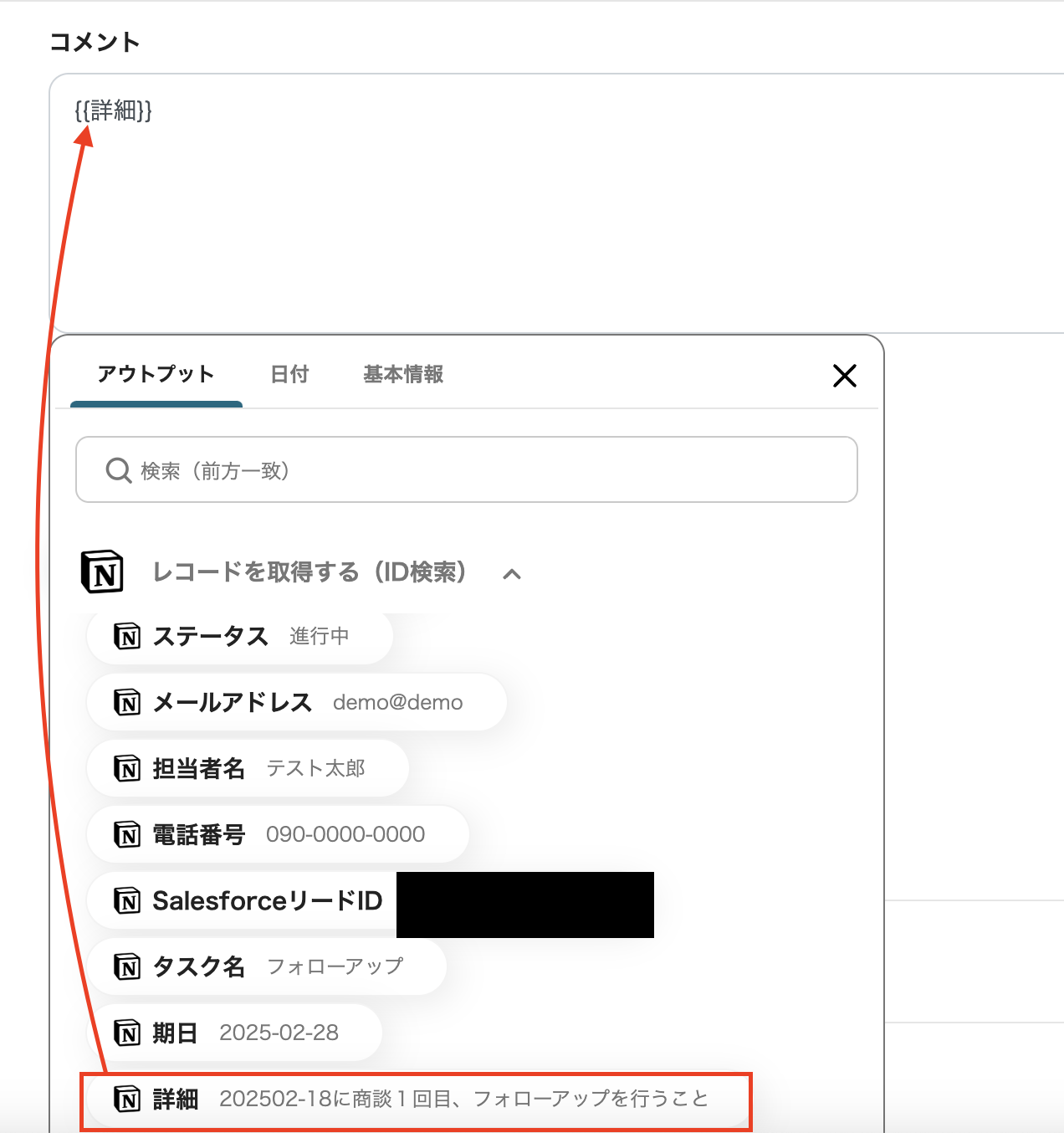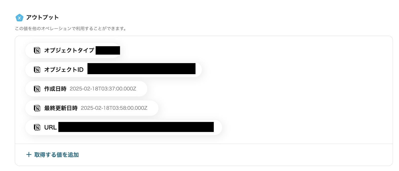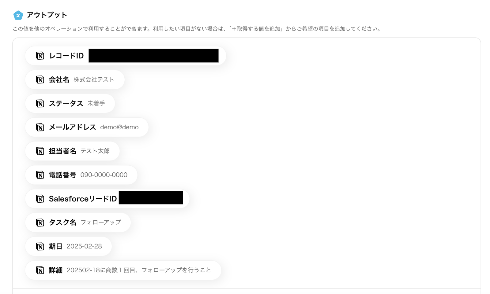 Notionのレコード情報がアウトプットとして取得できたら、テスト成功です!