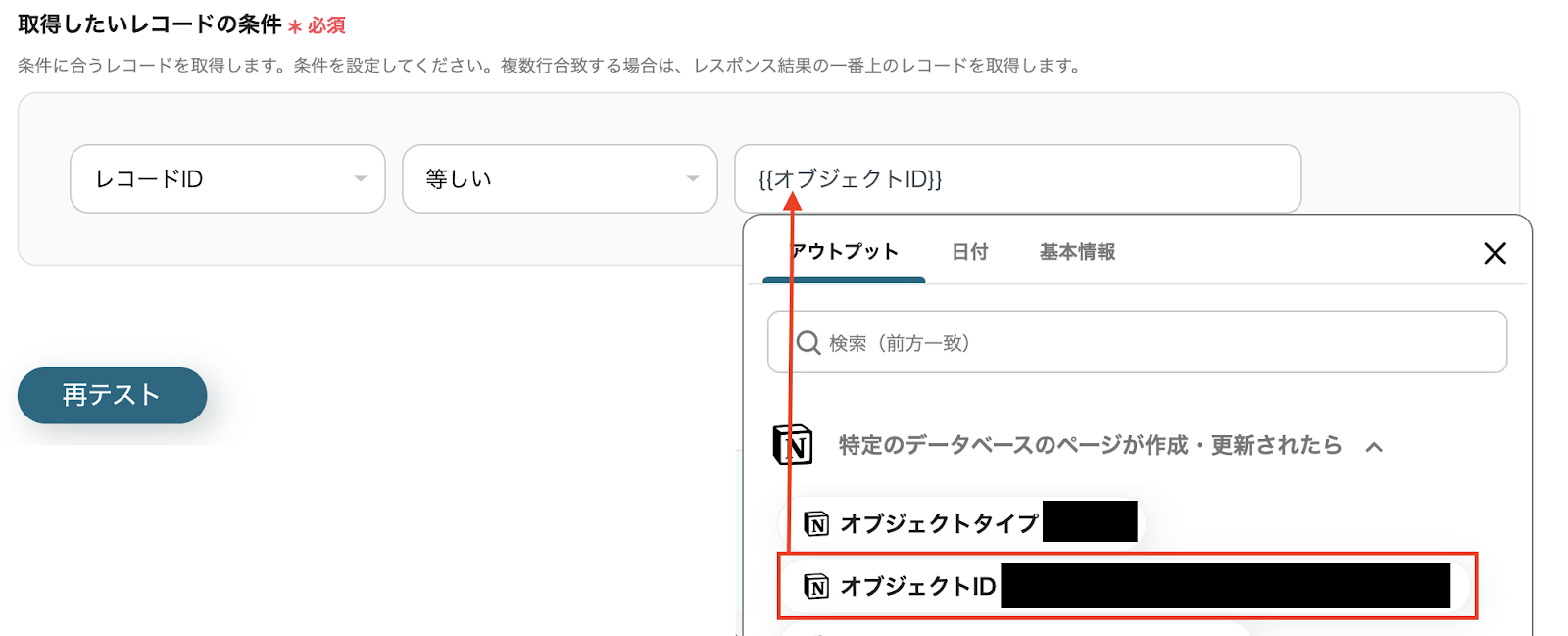 取得したいレコードの条件は、「レコードID」「等しい」に設定し、アウトプットから「オブジェクトID」を設定しましょう。