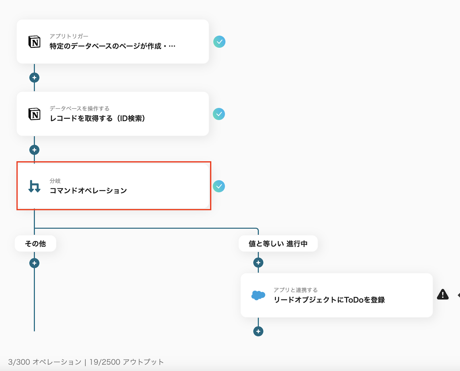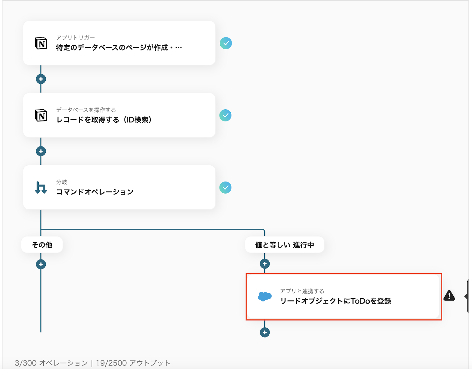 Notionの顧客ステータスが更新されたら、SalesforceにToDoを登録するフローです。