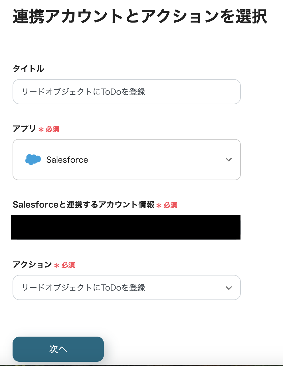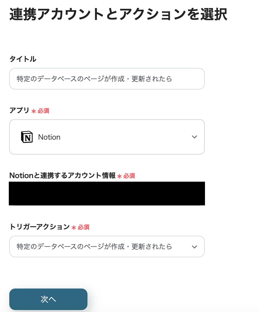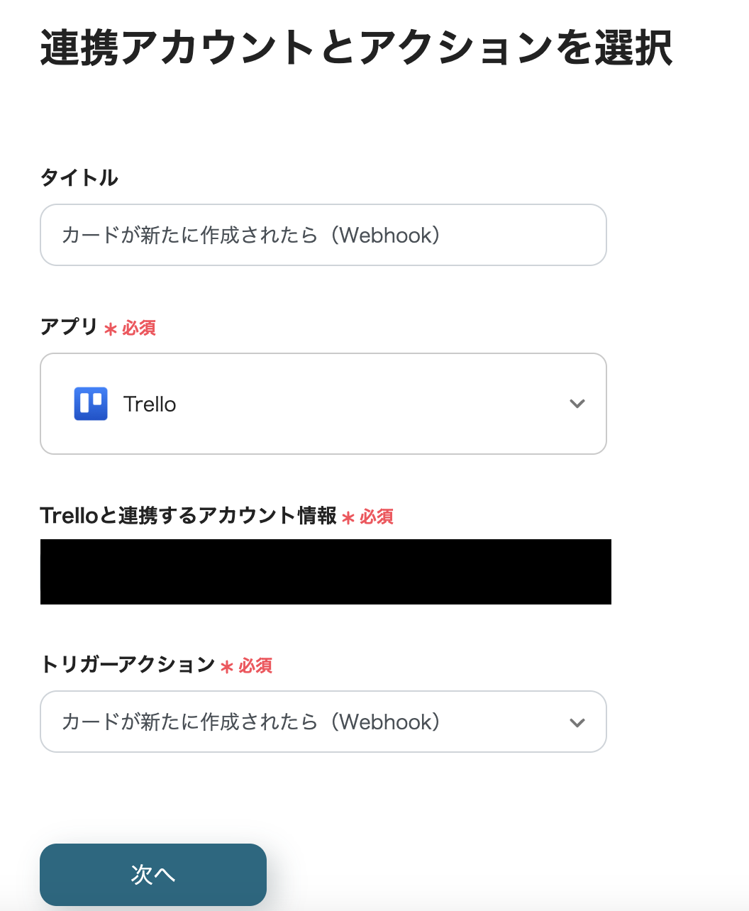 Trelloと連携するアカウントやアクションを確認し、「次へ」をクリックしましょう。