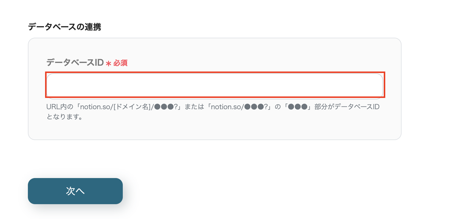 データベースIDを候補から選択するか、入力して「次へ」をクリックしましょう。