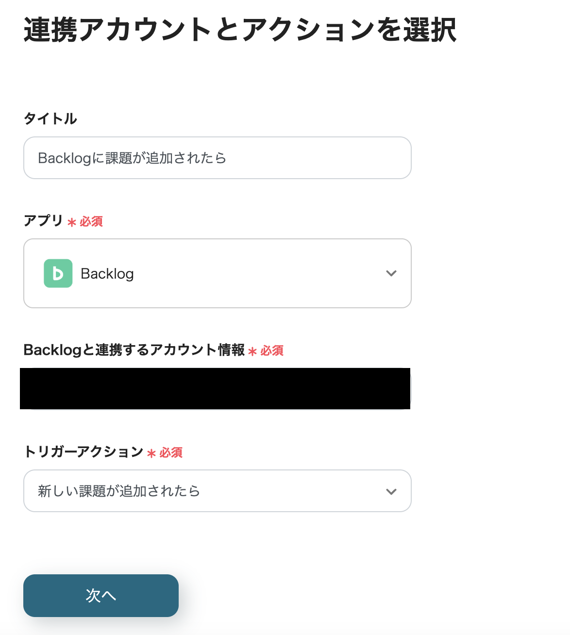 Backlogと連携するアカウントやアクションを確認し、「次へ」をクリックしてください。