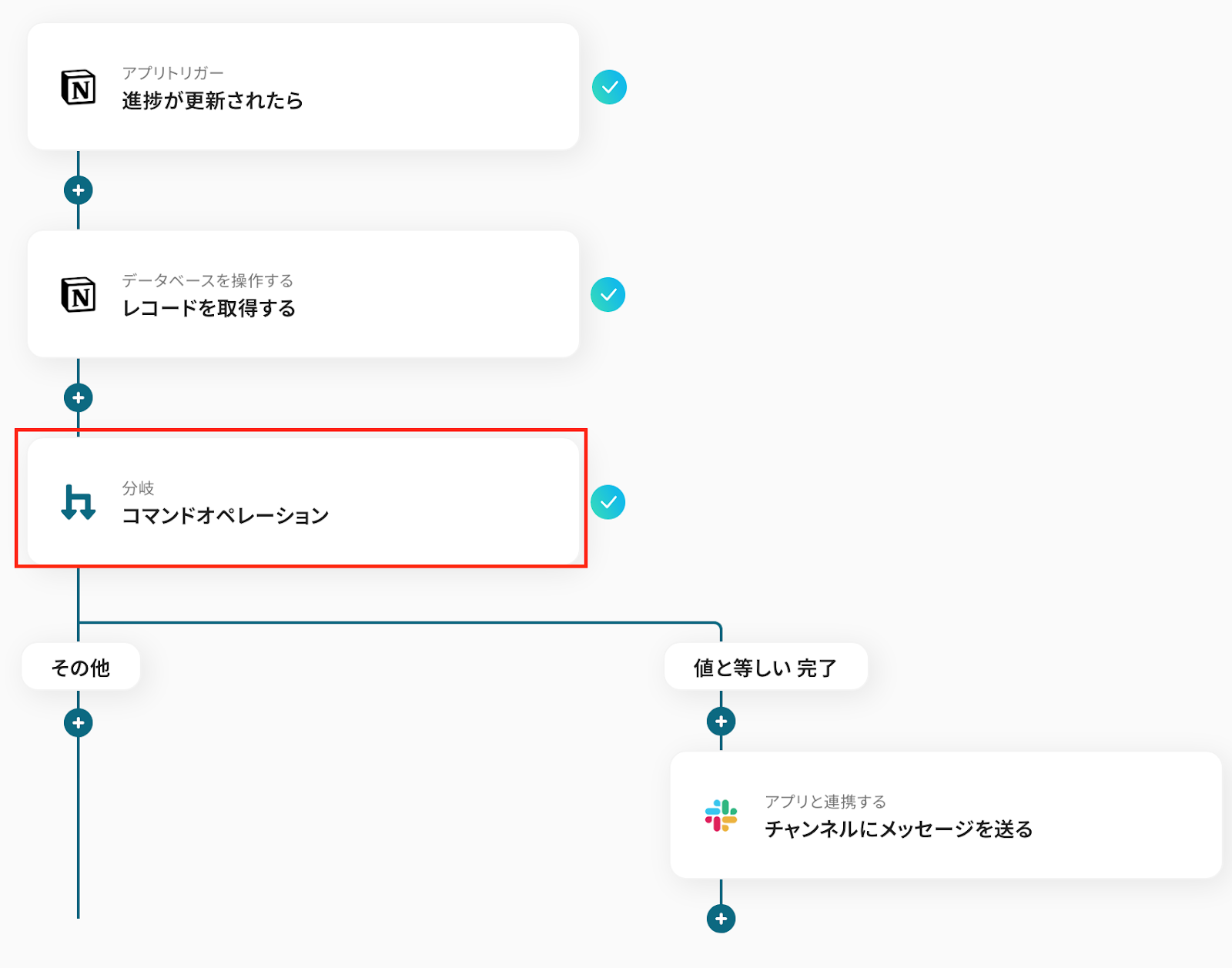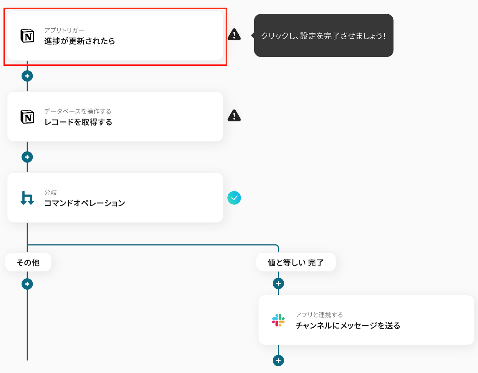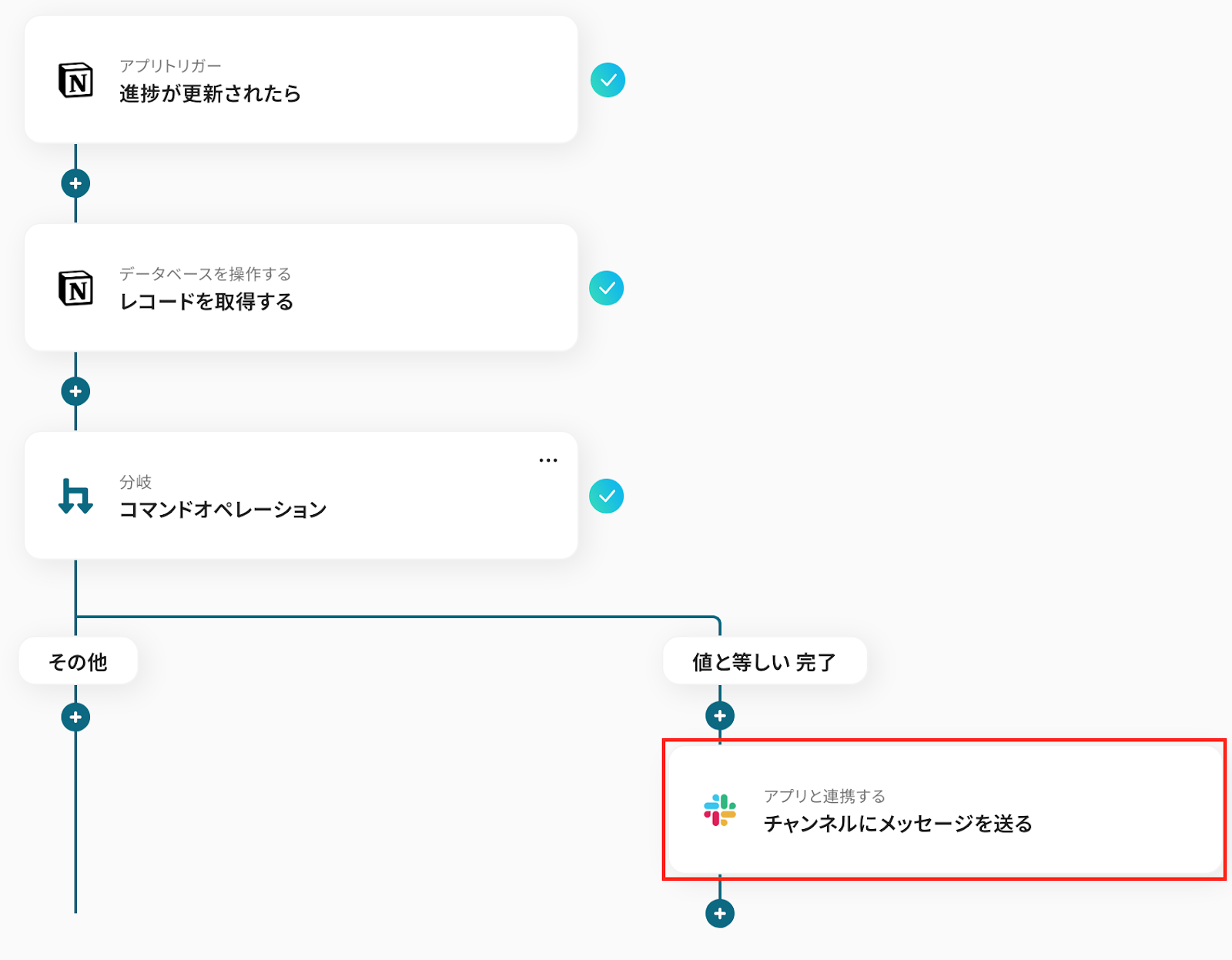 このフローでは、Notionでタスクの進捗を更新すると、自動的にSlackに通知が送られます。この自動化により、プロジェクトの現状を漏れなく把握でき、コミュニケーションの漏れや遅れを防ぐことができます。